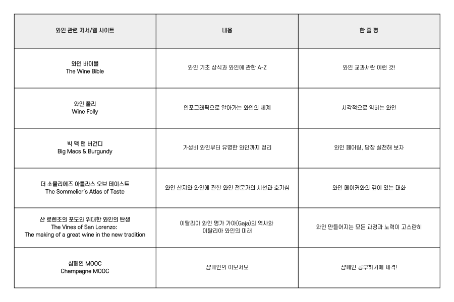 혹시 책 아닌 다른 매체로 와인에 다가가고 싶은가? 와인 폴리는 공식 웹사이트가 있어서(www.winefolly.com) 그곳에서 관련 정보를 얻을 수 있고 와인 스펙테이터(Wine Spectator)나 디캔터(Decanter)에서도 와인 관련 최신 정보를 확인할 수 있다. 샴페인을 좋아하는 사람이라면 꼭 방문해야 할 웹사이트로 Champagne MOOC(www.champagne-mooc.com)이 있다. 회원가입 후 클래식 버전으로 등록하면 무료로 샴페인 공부가 가능하다. 돈을 조금 지불하고 프리미엄 버전을 수강하면 수료증도 준다.