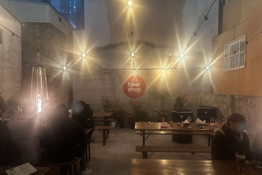 비어샵은 내부의 공간과 외부의 공간이 나뉘어져 있습니다. 내부의 공간에는 예닐곱 개의 테이블과 창을 바라보는 자리가 있고, 외부의 공간은 하늘이 뚫려 있습니다. 내부 공간에는 빈 좌석이 거의 없었고, 외부 공간도 3월 초의 밤공기가 쌀쌀했음에도 많이 채워져 있었습니다.