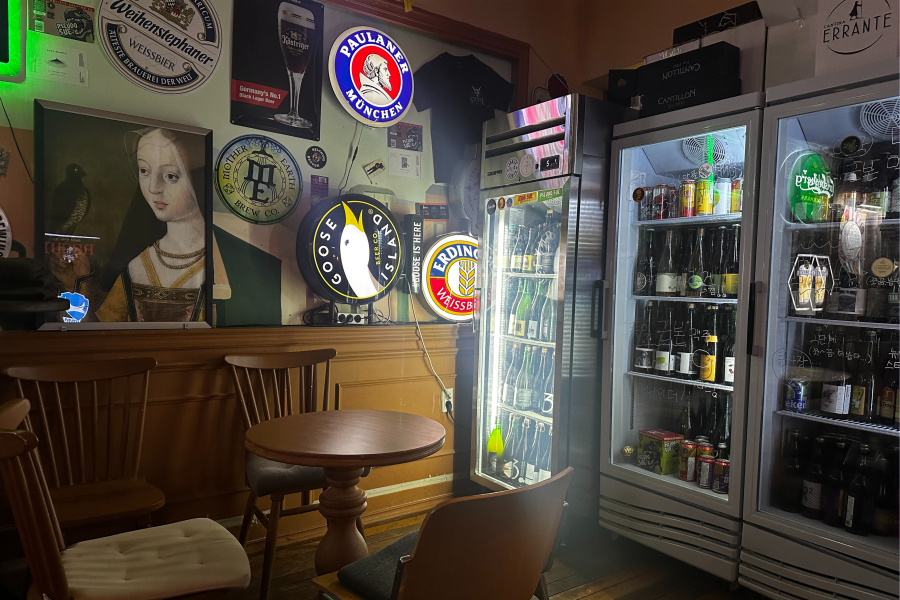 모든 속세와 인연을 끊고 맥주에만 집중해 보고 싶으면 프리츠프리츠에 가보세요. 고백하자면, 저는 이미 꽤 취한 상태에서 갔기 때문에 그 꿈을 실현하지 못했습니다. 술을 주제로 하는 취재는 이런 게 항상 문제입니다. 시간이 가면 갈수록 몸은 축나고 기억력은 흐려지기 때문입니다. 작은 뒷골목을 따라 걸으니 빨간 벽돌집 2층에 프리츠프리츠라는 간판이 보입니다. 계단을 따라 올라가면 수많은 맥주 통과 출입문에 덕지덕지 붙어 있는 맥주 스티커들이 반깁니다. 과연 이곳이 맥주 천국으로 올라가는 계단인가 싶습니다.