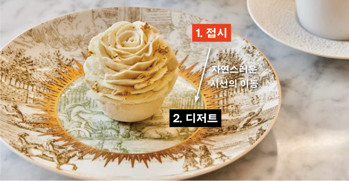 하지만, 그는 자신의 디저트를 배경의 자리에 양보하고 전경의 자리를 접시에 양보했죠. 덕분에 전경과 배경 사이의 관계가 명확해졌습니다. 전경에 들어갈 요소를 하나만 두었기에, 사람들은 자연스럽게 접시에 먼저 눈이 갑니다. 그 결과 베르나르도 접시의 장식적인 아름다움이 부각되었죠.