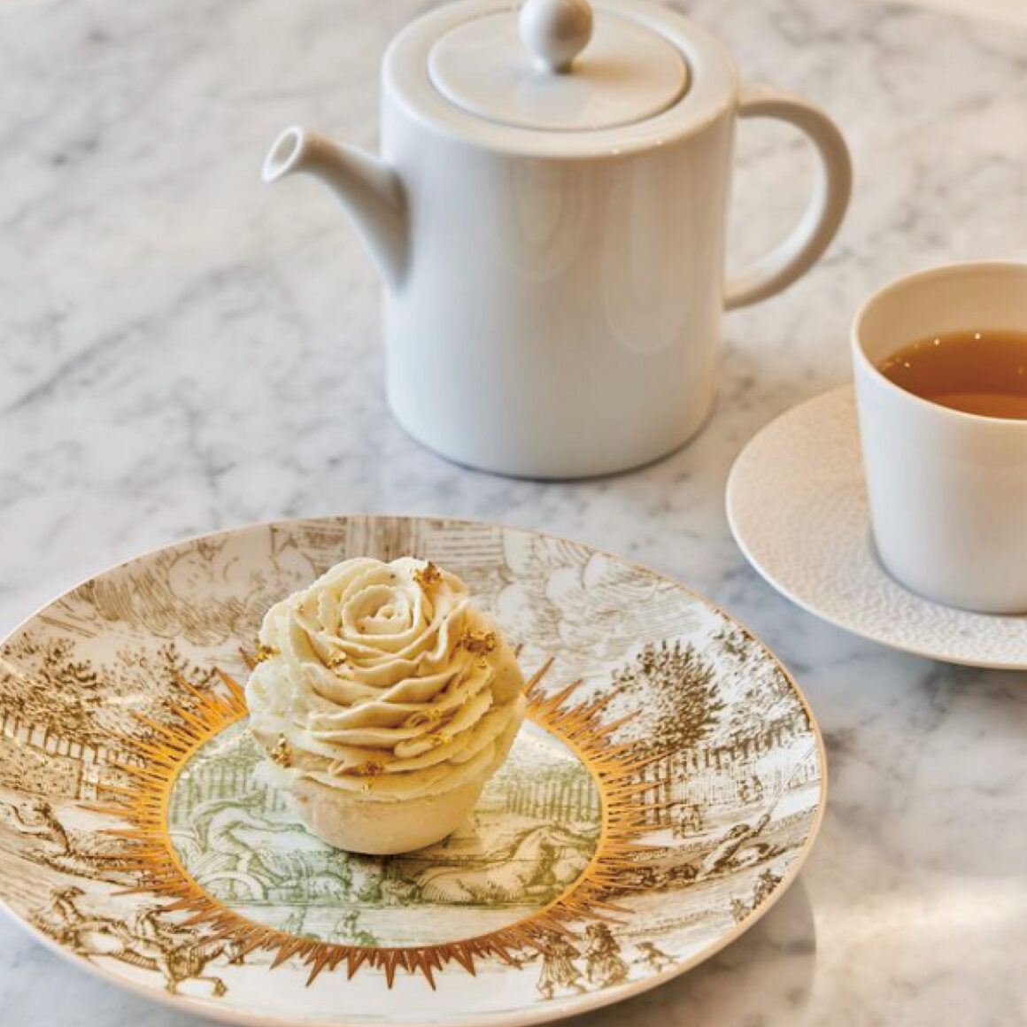 먼저, 그는 디저트 색상을 접시 색상과 비슷하게 만들었습니다. 또, 디저트 위에 있는 황금빛 장식이 접시의 장식보다 과하지 않죠. 또, 접시의 황금빛 장식과 같은 색상을 사용해서 대비를 줄였습니다.