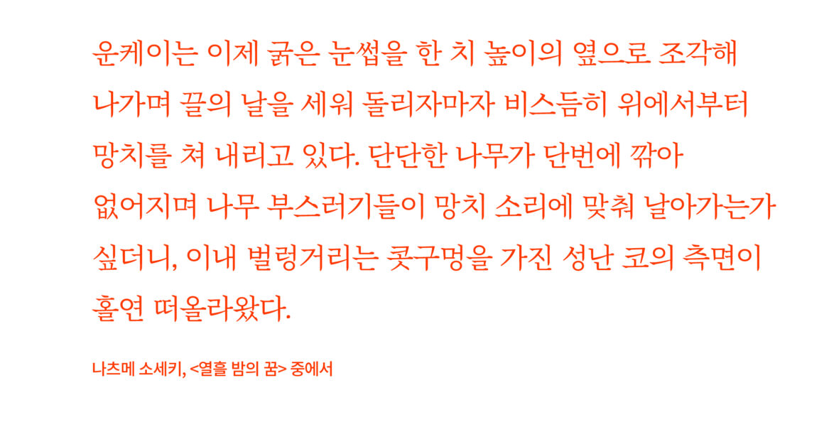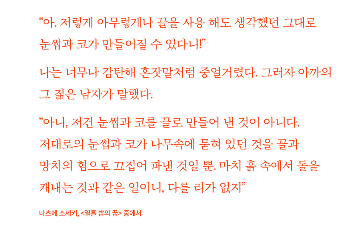 창작을 할 때 완전히 새로 만든다고 생각하면 어렵습니다. 원래 있던 걸 드러낸다고 생각하면 두려움이 줄어들죠. 이와 관련해 나츠메 소세키의 <열흘 밤의 꿈>에 흥미로운 대목이 나옵니다. 소설 속 주인공은 꿈에서 유명한 불상 제작자 ‘운케이’가 작업하는 걸 지켜보는 모습이 나옵니다.