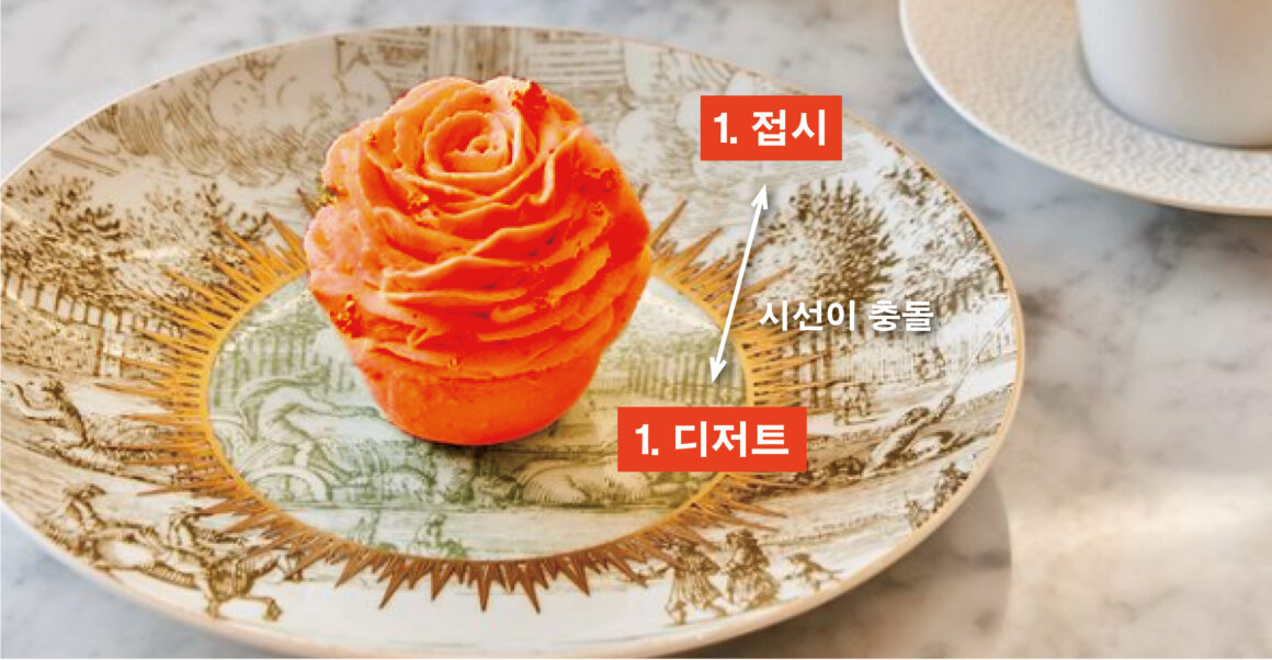 만약, 저스틴 리 셰프가 장미에 붉은색으로 포인트를 줬다면 전경에 나올 주인공이 2명이었겠죠. 시선이 먼저 가는 부분이 2곳이 되는 겁니다. 하지만, 주인공의 자리는 하나여야 합니다. 접시와 디저트가 동시에 눈에 들어오면, 감상자 입장에서는 어디에 눈을 두어야 할지 모르는 상황이 벌어지기 때문입니다.