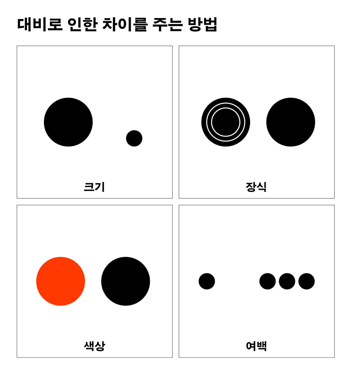 이 요소를 조절하면 대비를 줄 수 있습니다. 주의해야 할 점은, 대비를 줄 때는 항상 다른 요소 간에 관계를 생각해야 합니다. 왜냐하면, 대비는 상대적인 개념이거든요. 지면에 배치한 다른 요소와 ‘비교했을 때’ 차이를 조절하는 게 핵심입니다.