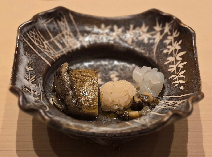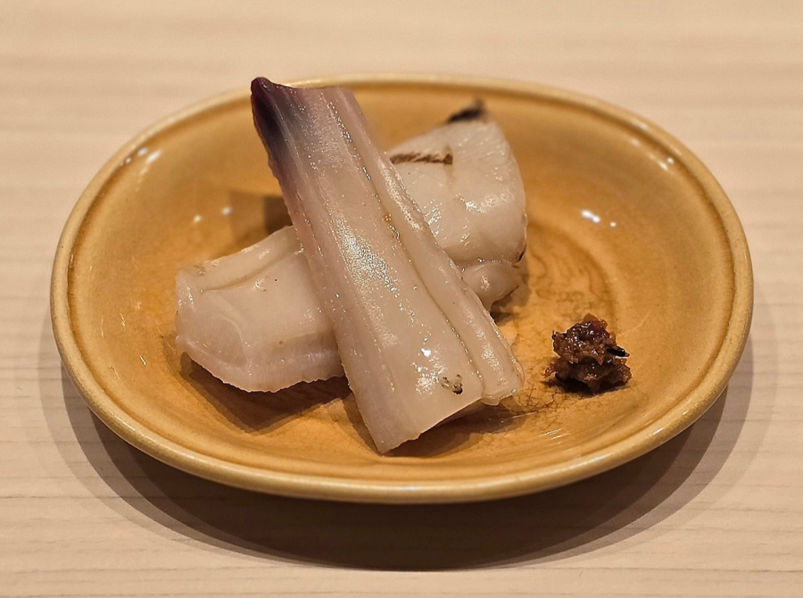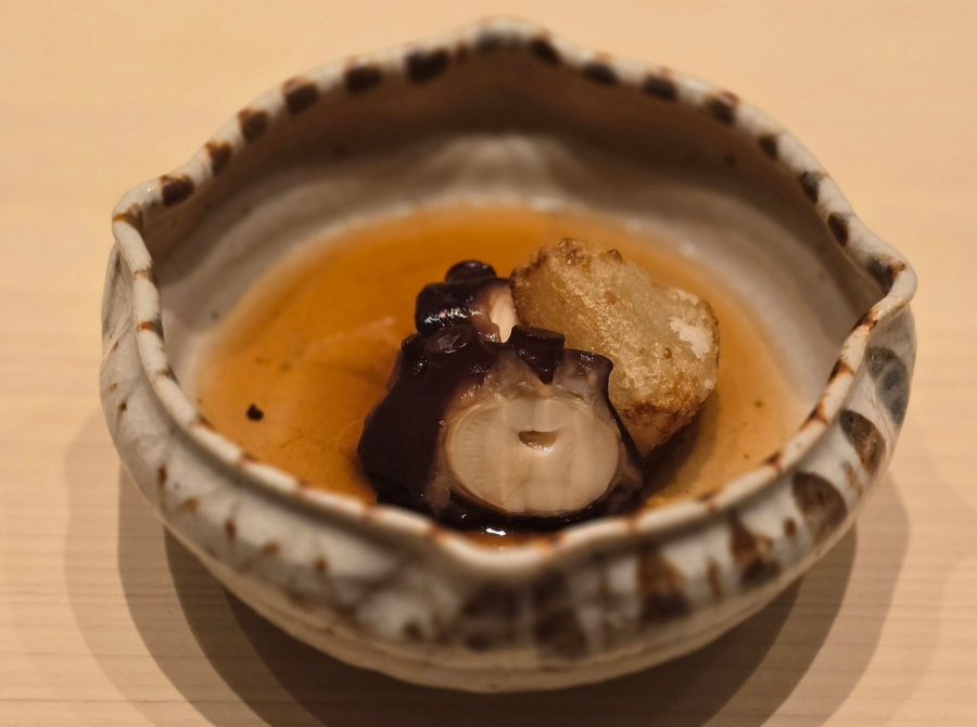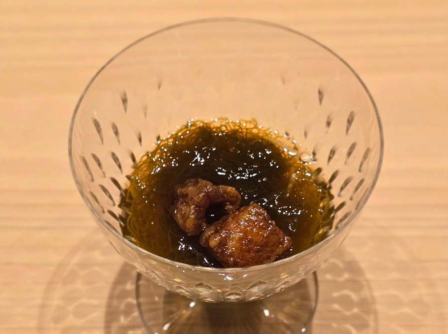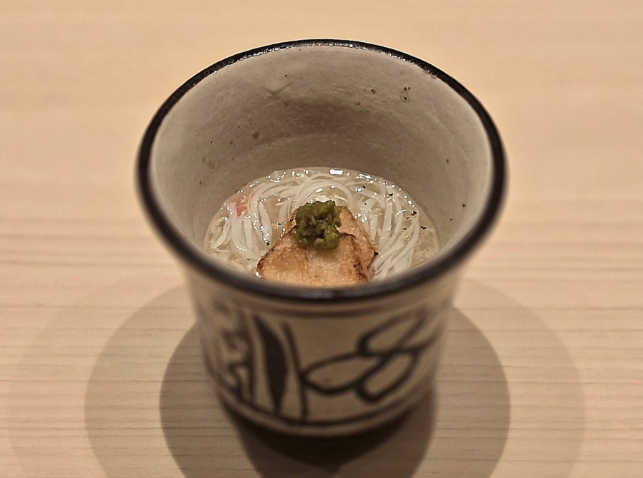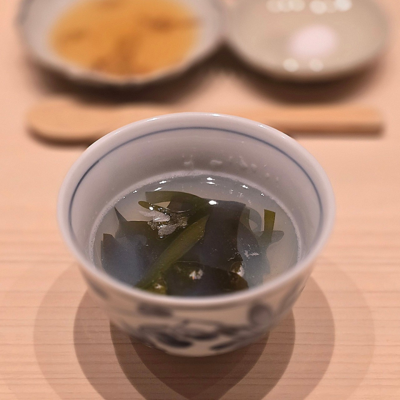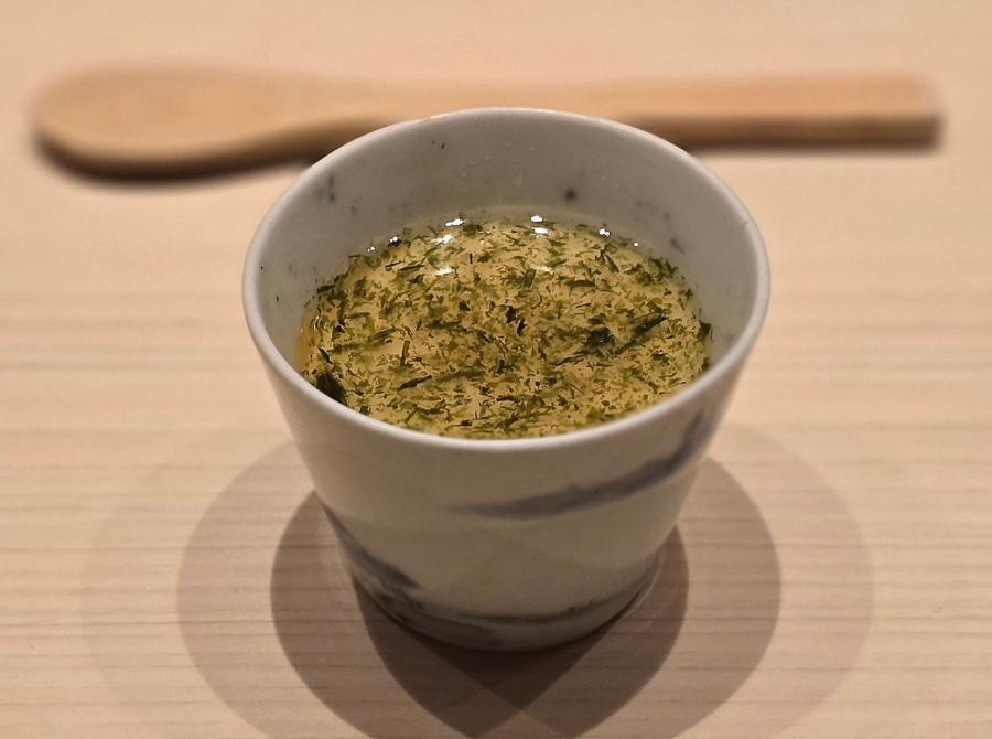 모시조개로 만든 스이모노. 맑은 국물을 머금으니 감미로운 바다의 풍미가 따뜻하게 스며들고, 제철 생미역을 폰즈에 살짝 적셔 음미하니 탱글한 식감과 짭짤한 고소함, 상큼한 감칠맛이 입맛을 깨운다. 이어질 다음 요리를 기대하게 만드는, 싱그러운 봄 바다를 담은 한 그릇.