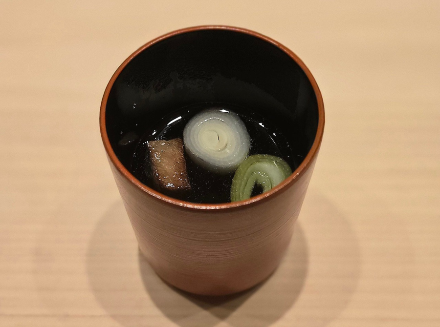 후반부는 완급 조절이 핵심이다. 단새우와 우니의 가벼운 부드러움으로 잠시 무게를 덜어냈다가, 프와그라를 연상케 하는 안키모로 다시 묵직함을 더한 후, 아나고큐리마끼, 훈연참치마끼, 간뾰마끼로 산뜻하고 깔끔하게 입맛을 환기시킨다. 마지막으로 맑고 따뜻한 네기마지루*로 식사의 잔여감을 말끔히 정리한 다음, 달콤한 타마고야끼와 상콤한 천혜향 양갱으로 마무리한다. 과시보다 균형을 택한 구성이다.