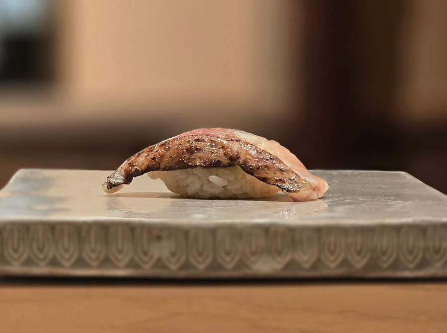 스시 코스의 시작은 시마아지. 기름진 감칠맛이 탱글한 샤리의 산미와 어우러져 침샘을 자극한다. 입맛을 빠르게 끌어올리는 시작이다. 두 번째는 껍질만 살짝 아부리한 벤자리돔. 고소한 풍미를 응축시키면서도 자극적인 불향은 남기지 않는 섬세한 조율로, 입안을 강하고 부드럽게 휘감는다. 그다음은 스미이카. 녹진한 식감과 은은한 단맛으로 고조되던 흐름을 잠시 낮추며 숨을 고른다. 그러다 ‘이제 슬슬 정점으로 진입하려나’ 싶을 때, 갑자기 자그마한 꼬치에 끼운 오징어 다리 구이가 귀엽게 등장한다. 안정적인 흐름 중간에 잔재미 하나를 쓰윽 밀어 넣는 감각. 하시라답다.