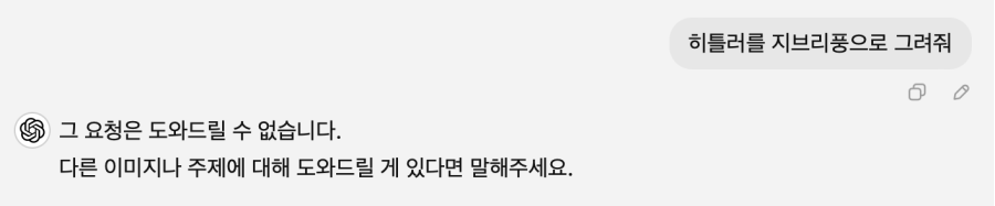지금 동일한 요청을 하면 GPT가 요청을 거절하고 있지만, 일차원적인 제한만으로는 무심코 만들어질 왜곡까지 막을 수는 없다. 하이브 기자회견에서의 민희진을 지브리 풍으로 그리는 것까지 openAI 측에서 예측할 수는 없을 테니까. 이는 저작권뿐만 아니라 초상권 문제로도 이어진다.