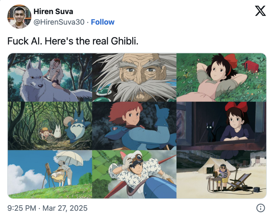 지브리는 특유의 인간적인 손맛이 있고 감정을 담은 디테일이 있다 보니 AI가 그 스타일을 차용했을 때 ‘기계가 만든 감성적인 이미지’라는 낯설고도 매력적인 느낌까지 준다.