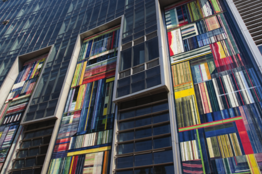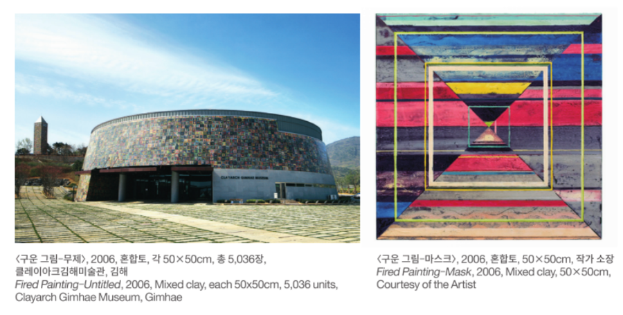 전시 중반부에는 또 다른 변화가 등장한다. 이번에는 도자가 건축과 결합한다. 서울 센트럴시티나 클레이아크 김해미술관 같은 건물 외벽에 설치된 도자 타일 작업이 그 예다. 작가는 이를 “불의 회화(Fired Painting)”라고 부른다. 흙으로 만든 타일을 이용해 그림을 그리는 방식이다.