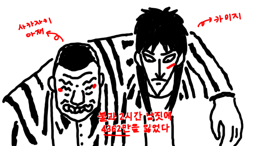 <도박묵시록 카이지>는 인간의 밑바닥 감정을 적나라하게 드러내기로 유명한 도박 만화입니다. 도박꾼 카이지는 주인공답지 않은 모습을 종종 보이는데요.