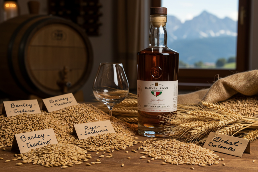 이탈리아 위스키는 와인의 영향을 받아 몰트와 곡물에서도 테루아를 강조하는 경향이 있다. 예를 들어 그라파 생산자인 빌라 데 바르다(Villa de Varda)는 인근 농장에서 재배한 보리, 호밀, 밀을 사용하고, 사르데냐의 실비오 카르타 와이너리(Silvio Carta Winery)는 오직 섬 내에서 재배한 보리만을 사용한다. 리구리아 지역의 곡물 생산 및 제분 업체인 물리노 디 사셀로(Mulino di Sassello)는 자가 생산 옥수수로 미국 스타일 위스키를 출시했으며, 조만간 엠머(고대 밀의 일종) 위스키도 선보일 예정이다.