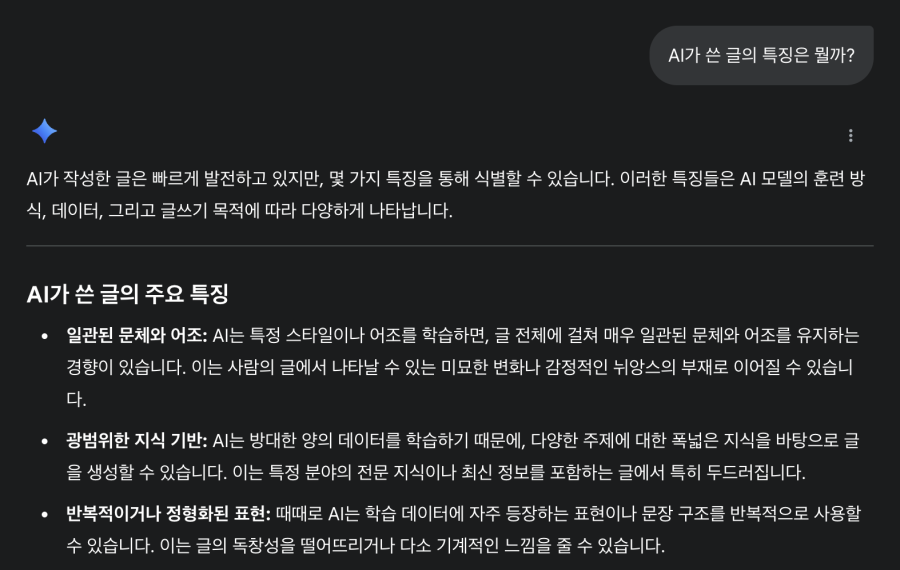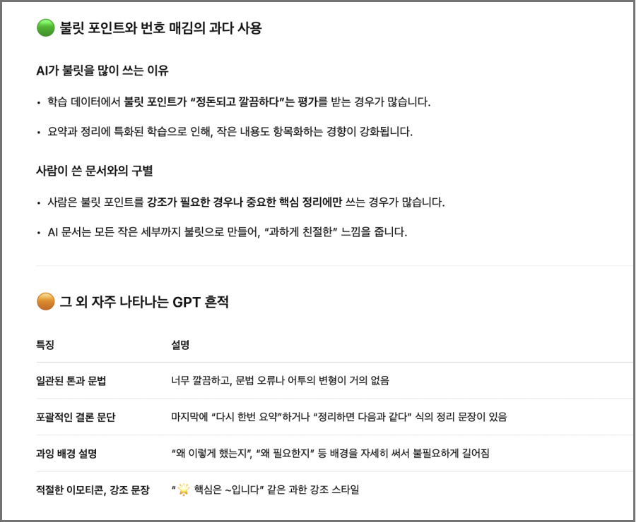 AI는 정보의 명확성을 극단적으로 추구하는 성향이 있습니다. 독자가 혼동하지 않도록 모든 내용을 작은 단위로 나누고, 불릿 포인트나 번호 매김으로 각 항목을 구분하며, 반복해서 정리를 덧붙입니다. 이런 방식은 문장을 보다 깔끔하고 일관되게 보이게 하지만, 결국에는 기계적으로 나열된 느낌을 주며 과도한 친절함을 연출하게 됩니다. 그렇게 쪼개진 내용들은 오히려 문서의 흐름을 단절시키고, 사람 고유의 사유와 맥락을 지워버립니다. 이런 구조화 집착이 불필요한 불릿 포인트 과잉으로 이어집니다.