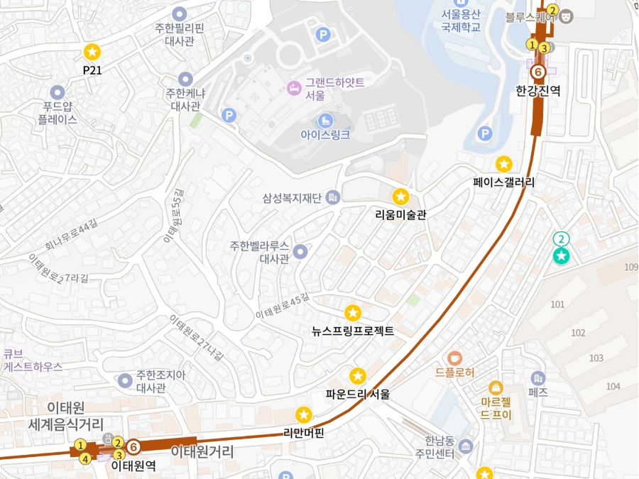 동시대 블루칩 작가들의 대형 전시를 보고 싶다면, 용산(한남동·이태원동) 일대도 빼놓을 수 없다. 리움미술관을 필두로 페이스·리만머핀· 에스더쉬퍼·타데우스로팍 등 세계 정상급 갤러리들이 포진한 글로벌 갤러리 클러스터이기 때문이다. 다만 이 지역은 먼저 소개한 삼청로 일대와 달리 미술관과 갤러리들이 산발적으로 퍼져있다. 6호선 한강진역-이태원역 사이, 4호선 신용산역 주변, 그리고 유엔빌리지 권역까지 드문드문 흩어져있어 하루 코스로 둘러보는 건 불가능하다. 지도에 주요 갤러리를 저장해 놓고 블록별로 나누어 공략하는 방법을 추천한다.