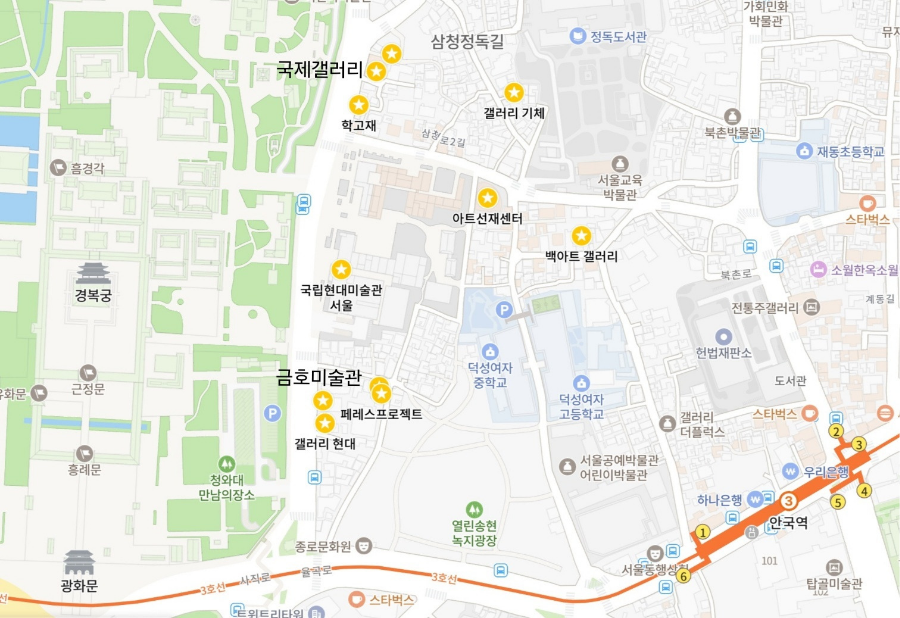 그중에서도 미술관과 갤러리가 운집한 종로구 일대(인사동·삼청동·북촌·평창동 등)가 가장 뜨겁다. 특히 삼청로는 전통적인 갤러리 스트리트로, 갤러리현대·금호미술관·국립현대미술관·아트선재센터·국제갤러리 등 대형 전시를 선보이는 주요 미술관과 갤러리들이 모여있다. 구석구석 모두 둘러보면 좋겠지만, 선택과 집중이 필요한 상황이라면 예닐곱 군데 정도로 추려 아래 동선을 따라가며 돌아보는 걸 추천한다.