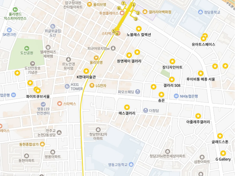 여기서 조금 더 발길을 넓히면 청담·도산공원 라인의 송은아트스페이스, 신세계갤러리, 아뜰리에 에르메스, 호림박물관 신사본관, 화이트큐브서울, 페로탕, 서울옥션, 탕컨템포러리, 이유진갤러리, G gallery 등지에서도 주목할 만한 전시들이 열리고 있다.