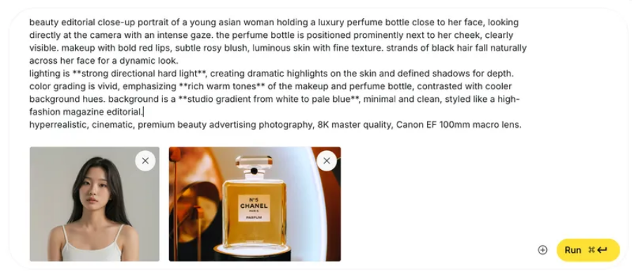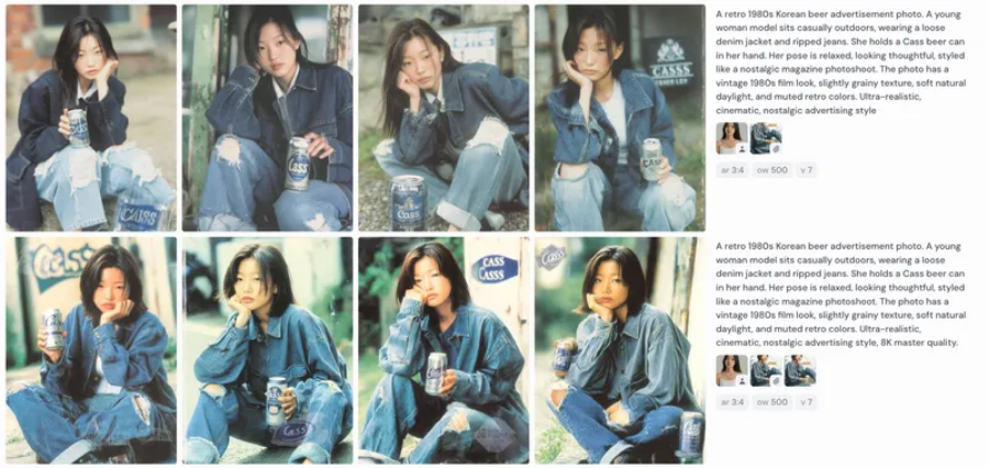 지난 글에서 제가 가상 모델을 생성했습니다. 사람을 만들 때 참조 이미지를 넣으면 너무 그 사람과 비슷하게 나와서 글로만 설명해서 만들었는데요. 이렇게 예시 없이 AI에게 일을 시킬 때는 정말 구체적으로 묘사하면 원하는 결과물에 가까워집니다. 이를테면 모델을 만들 때 나이대, 인종, 헤어스타일뿐만 아니라 생김새, 메이크업 스타일, 주변 환경, 어느 정도 피부를 묘사할지 등 쓰면 쓸수록 좋아집니다.