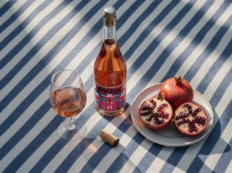 돗자리 위에 석류와 와인잔을 만들었습니다. 마개의 형태, 라벨 디자인, 와인의 컬러, 빛이 맺힌 그림자까지 모두 자연스럽게 구현됐습니다.