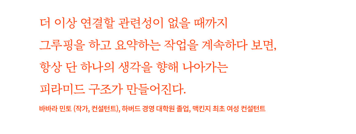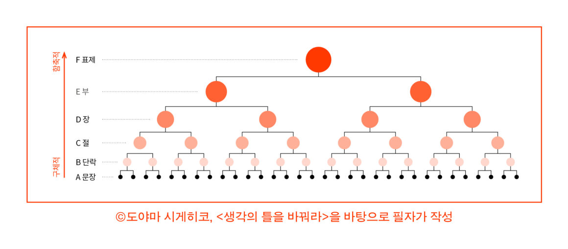 생각의 방법인 A를 모으면 단락 B가 됩니다. 단락이 모이면 C에 해당하는 절이 되고, 절이 모여 챕터, 즉 장이 만들어집니다. 이게 D입니다. 또 이렇게 장이 모이면 1부, 2부에 해당하는 E가 오고, 마지막으로 전체를 마무리하는 표제 F가 됩니다. 이와 관련해 바바라 민토는 말합니다.