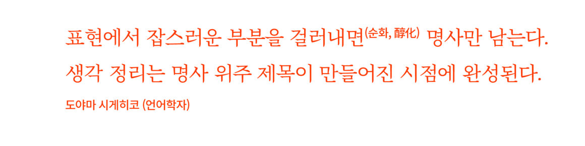 마지막으로 네이밍입니다. 네이밍을 할 수 있다는 건 생각을 단순한 명사로 나타낼 수 있을 만큼 생각이 정리가 됐다는 뜻입니다. 네이밍을 할 수 있을 정도가 돼야 표현을 만들 수 있습니다. 언어학자 도야마 시게히코는 그 이유에 대해 다음과 같이 말했습니다.