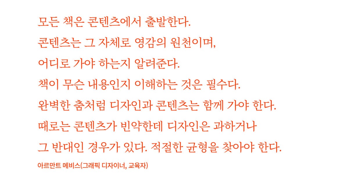 이때 표현부터 만들지 않도록 주의해야 합니다. 책을 디자인하는데, 내용이 정해져 있지 않은 상태에서 표지를 만들 수 있을까요? 만들 수 있겠지만, 내용과 찰떡처럼 붙지 않을 겁니다. 왜냐하면, 표현을 만들기 위해서는 내용이 탄탄하게 다듬어진 상태여야 하기 때문입니다.