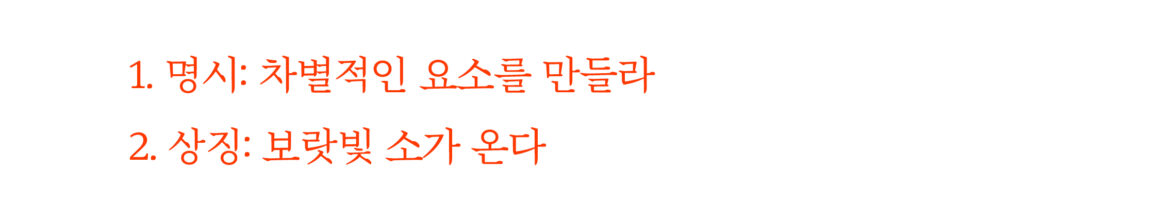 세스 고딘은 책을 만들 수 있을 만큼 내용을 체계화했겠죠. 세스 고딘은 ‘차별적인 요소’를 만들라는 내용을 ‘보랏빛 소가 온다’라는 상징을 만들어 표현합니다. 이렇게 상징을 만들면 독자에게 인식을 만들기 쉬워지죠.