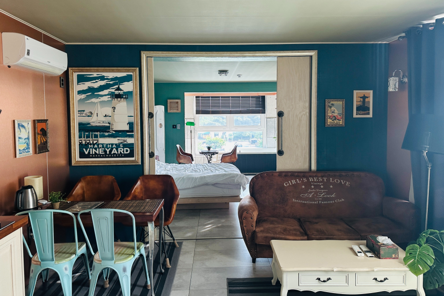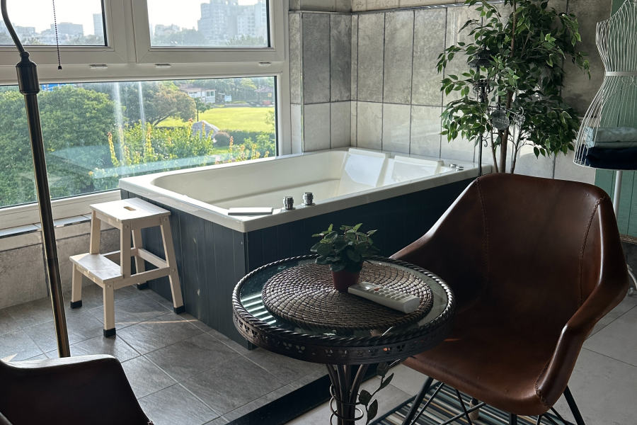 처음 고부루를 알게 되었을 때 가장 흥미로웠던 것이 맥주 스파가 있는 맥주 펜션이었습니다. 이번 제주도 맥주 양조장 취재 여행에서 고부루 펜션에 머물면서 펜션에 대해서도 샅샅이 살펴봤습니다. 객실에 들어서면 우선 미국식 인테리어에 눈이 즐겁습니다. 마치 전 세계를 여행하는 듯합니다. 수많은 그림 액자와 패치, 그리고 특이하게도 의자가 매우 많습니다. 이러한 인테리어 컨셉은 고 대표가 미국으로 갔던 양조 여행에서 영향을 받았다고 합니다. 고 대표는 앞으로 만들어갈 맥주의 방향성을 잡기 위해 샌디에이고, 라스베이거스, LA, 애틀랜타, 뉴올리언스 등의 크고 작은 맥주 양조장을 방문했는데, 여러 숙박업소를 이용할 수밖에 없었고, 그러면서 자연스럽게 펜션 사업의 방향도 잡을 수 있었습니다. 객실은 뉴올리언스의 미국 남부와 샌디에이고의 미국 서부 스타일을 기본으로 레트로하면서도 도시적인 감성을 적절히 섞어 완성했습니다. 여행 중 구매한 소품과 액자, 그림을 인테리어에 활용하였습니다. 그리고 기대하던 맥주 스파는 침대 건너편 창가에 덩그러니 놓여 있습니다.