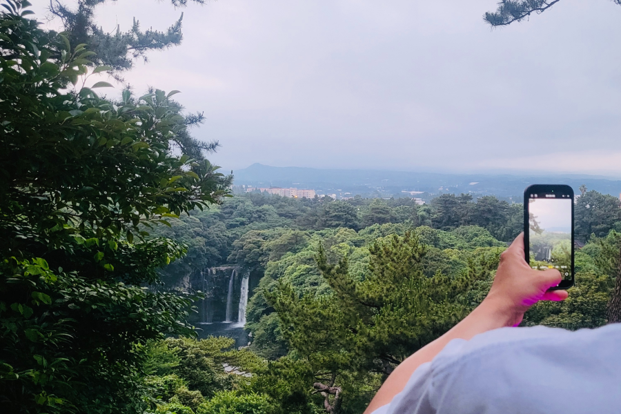 고부루의 건너편에 있는 칠십리시공원에서는 멀리 천지연 폭포를 조망할 수 있습니다.