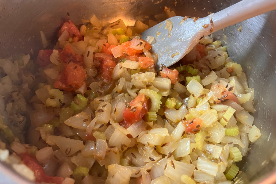 ②커민 향이 오르면, 다진 생강(약 1작은술), 대충 다진 양파(1/2개), 대충 자른 셀러리나 대파(1/2대) 더해(요 둘은 생략 가능) 가볍게 볶고(이때 살짝 소금 뿌려요), 토마토(1개. 껍질 까고 씨 빼서 대충 컷) 더해 또 볶아요(이때도 살짝 소금 간).