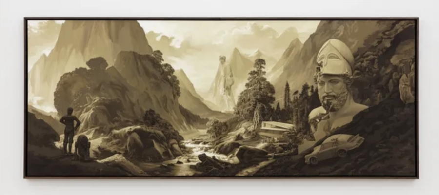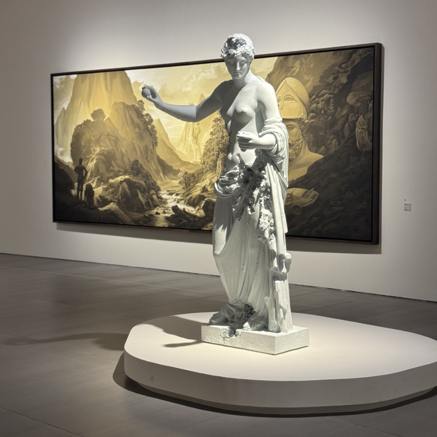 조각상 뒤의 회화 작품은 2023년 작품 <숭고한 계곡, 스투바이탈>인데요, 폭이 5미터나 됩니다. 거대한 알프스 스투바이탈 계곡 아래에서 발굴된 유물들을 영화의 한 장면처럼 그렸습니다. 아샴은 17세기 이탈리아 카프리치오 양식과 19세기 독일 낭만주의 회화 스타일로 작업했는데요. 그림을 자세히 보면 스타워즈의 알투디투와 쓰리피오, 그리스 장군 페리클레스의 거대한 두상, 포르쉐 911 터보와 각종 건축물이 쌓여 폐허처럼 연출되어 있습니다.