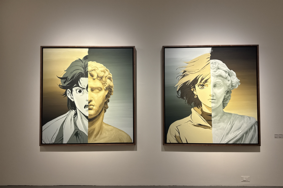 세 번째 파트에서는 고전적인 조각상과 애니메이션 캐릭터의 얼굴을 절반씩 결합하여 한 화면에 배치한 <분절된 아이돌> 시리즈가 있습니다. 과거의 고전적인 조각상은 인체의 가장 이상적인 아름다움과 조화로움을 추구했죠. 보통 애니메이션 캐릭터들도 비현실적인 외모와 화려하고 개성 있는 설정을 두고 있고요. 서로 시대는 다르지만 이상화된 모습으로 대중들을 매료시킨다는 공통점이 있습니다. 고대와 현대의 우상을 조합한 셈입니다.