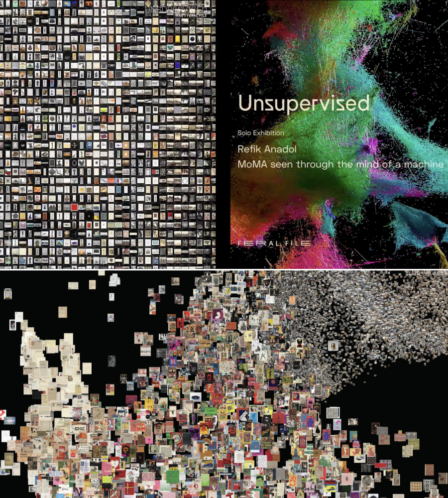 이와 유사한 작업으로 작년 뉴욕 현대미술관에 전시되었던 가 있습니다. ‘감독 되지 않은’, ‘지도 되지 않은’이라는 뜻의 작품인데요. 뉴욕 현대미술관의 138,151개 작품 데이터를 학습했습니다. 어떤 알고리즘으로 구현했는지 이해하고 싶지만 참 어려운데요. StyleGAN2 ADA를 사용하여 이미지 데이터를 주제별로 클러스터링하고, 데이터의 맥락을 반영해 학습했다고 합니다.