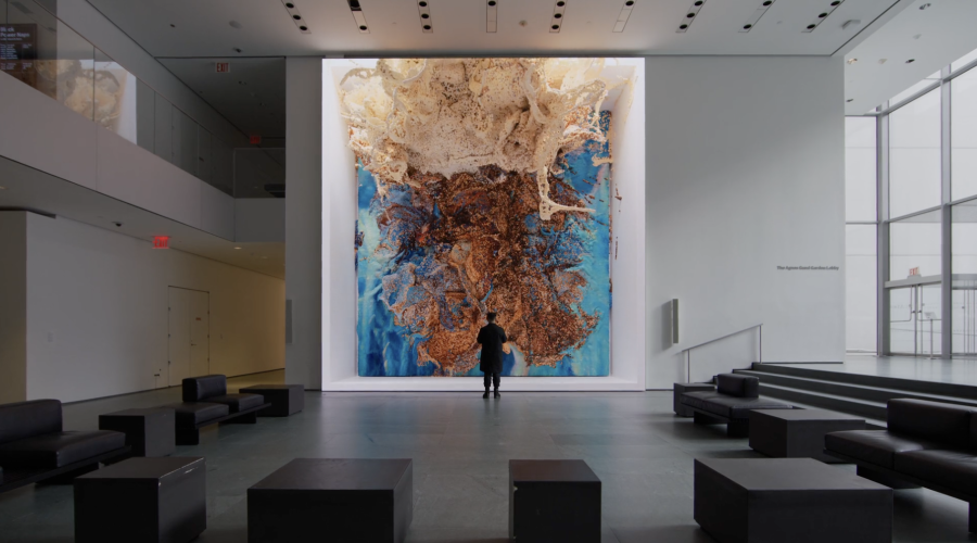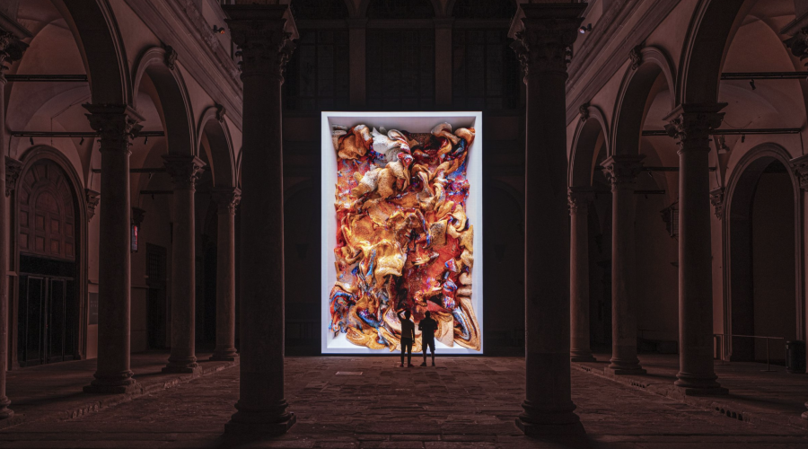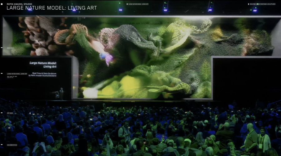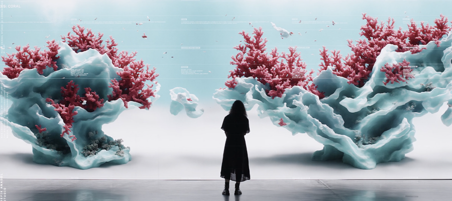레픽 아나돌은 기후 변화 문제로 인해 사라져가는 산호에서 영감을 받아 1억 개의 실제 산호 이미지를 사용하여 AI 모델에 학습시켰습니다. 머신러닝으로 만들어진 산호 이미지는 50억 개가 넘고, 이를 알고리즘으로 만들어 새로운 비주얼과 색상으로 조합하여 구성합니다. 이후 다시 AI를 활용해 6K 해상도로 키운 결과물입니다.