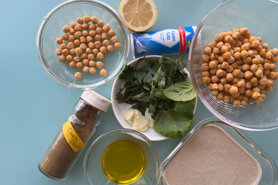 병아리콩을 넉넉한 물에 담가 최소 24시간 충분히 불리는 것부터 시작해야 합니다(더 손쉽게 만들고 싶거나, 병아리콩을 쉽게 구할 수 없다면 캔 제품을 쓰면 간편. 타히니도 일반 참깨로 대체 가능하고요).