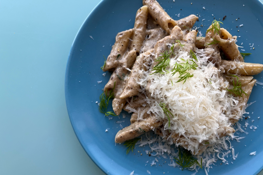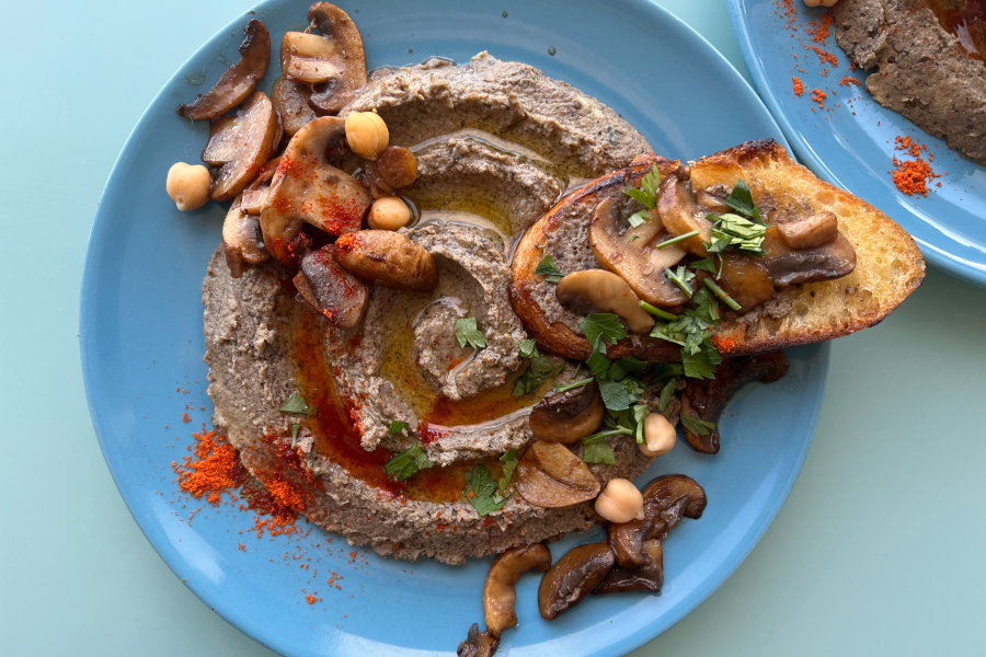 이 기본 훔무스 재료에 올리브오일에 볶은 버섯을 함께 갈아 주면 감칠맛 폭발하는 ‘버섯 훔무스’가 탄생합니다. 볶은 버섯 일부를 덜어 뒀다가 토핑에 사용하면 비주얼도 한층 먹음직스러워지고요. 그 자체로 감칠맛 덩어리인 콩과 버섯의 만남, 맛의 시너지가 충분히 상상되지 않나요? 버섯의 비율은 기호에 맞추면 되는데, 1팩이면 충분히 향미를 낼 수 있어요. 만약 뒥셀(duxelles =잘게 다진 버섯, 샬로트, 허브 등을 버터로 볶아 페이스트화한 것)이 있다면, 볶은 버섯 대신 뒥셀 1~2큰술을 병아리콩과 함께 갈아 주면 좀 더 손을 덜 수 있죠. 버섯 훔무스를 활용한 파스타도 진미인데요. 1인분 기준, 프라이팬에 버섯 훔무스 2~3큰술과 생크림 반 컵을 섞어 끓이다가, 삶은 파스타를 넣어 재빨리 볶아주면 정말 맛난 파스타가 순식간에 완성됩니다.