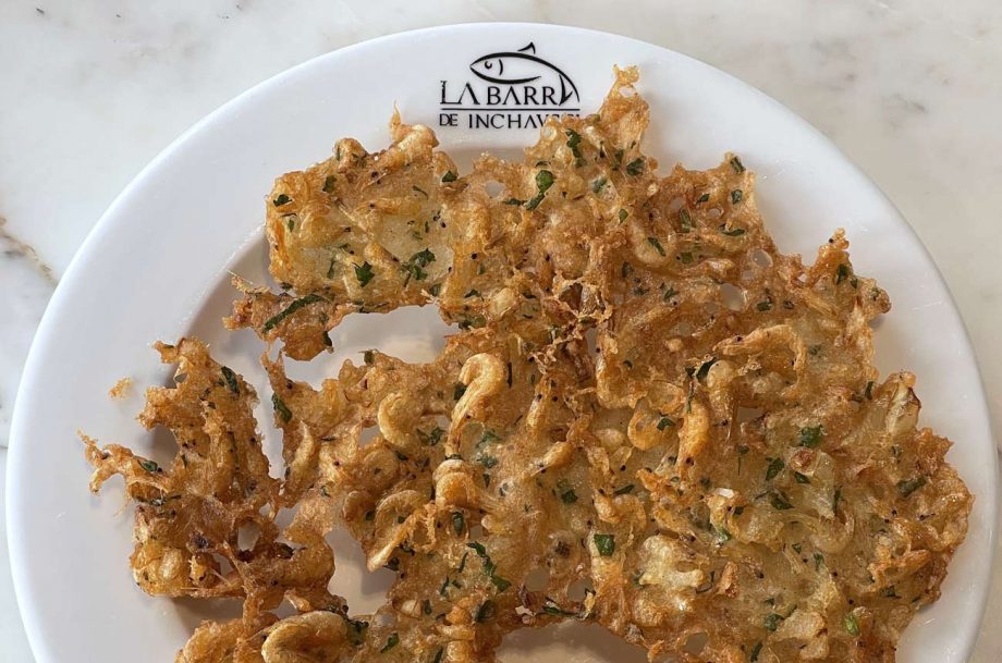Barra Inchausti 레스토랑의 카디스 지역 특산품인 까마로네 토르티야(새우 프리터). 사진: Shawn Hennessey