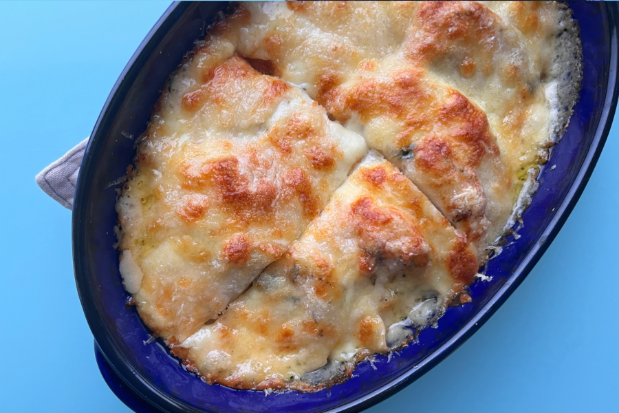 2) 내열 접시로 그대로 옮겨 담고 그뤼에르 치즈나 파르미지아노 레지아노 치즈를 듬뿍 올린 후, 220도로 예열한 오븐(하단)에 10~15분(오븐마다 차이), 우유가 거의 다 졸아들 때까지 구우면 끝!
