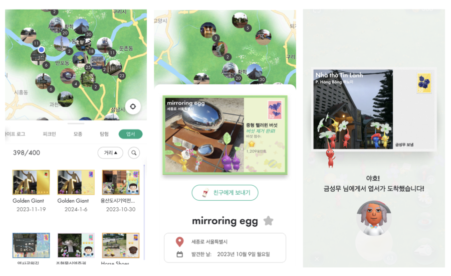 실제 위치 기반 서비스다 보니 구글 지도에 등록되는 정도의 장소라면 모두 피크민 블룸 앱에 뜹니다. 그 지역에 가면 그 지역에서만 얻을 수 있는 엽서가 있고, 친구에게 보낼 수도 있어요. 더 재밌는 점은 실제 거리가 반영된다는 점이에요. 집 근처 100m 거리로 피크민을 보낼 땐 1~2분 이내에 돌아오는데 해외로 나가면 돌아오는 데 100일 이상 걸리기도 하더라고요. 이 엽서를 모으기 위해 저는 해외여행을 갈 때마다 피크민 블룸을 켰고, 특별한 엽서를 얻고 싶어서 외국인 친구들을 추가하기도 했어요.