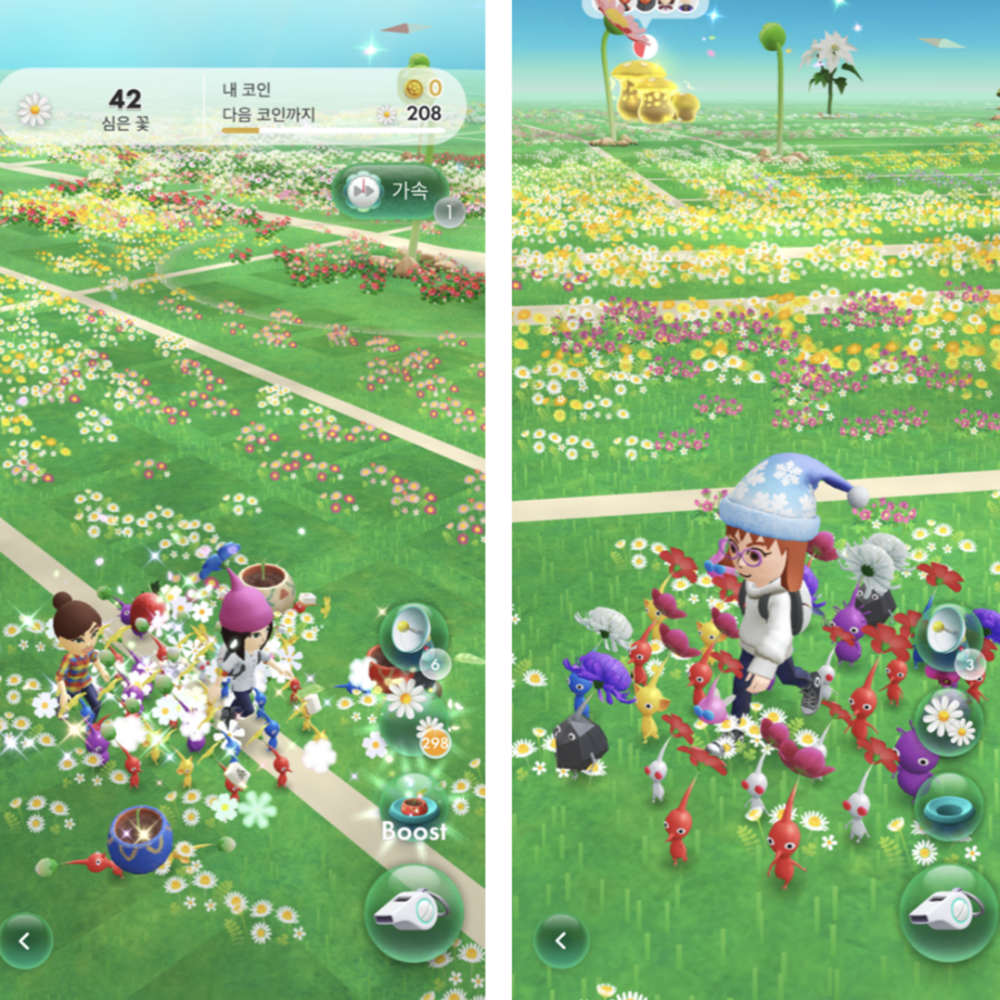 피크민 블룸은 거칠게 설명하자면 ‘만보기 게임’이에요. 캐릭터 자체는 닌텐도 피크민의 IP를 사용하지만, 플레이 방식은 포켓몬고와 유사한 점이 더 많습니다. 걷기 기능을 켜고 걸으면 실시간으로 내 주변 지도에 꽃이 피어지고, ‘피크민’이라는 생물을 기르고 수집할 수 있어요. 기능이 일단 단순해요. 많이 걸으면 걸음 수에 따라 더 많은 꽃을 피울 수 있고, 피크민도 많이 모을 수 있죠. 주간 미션, 월간 미션도 있고 친구와 함께 걸을 수도 있어요. 친구와 함께 걸을 땐 실제 친구의 아바타가 화면에 함께 뜨고요.