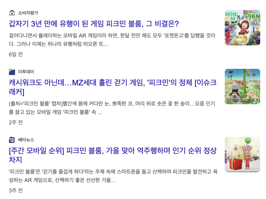 닌텐도의 인기 IP를 활용한 모바일 게임 ‘피크민 블룸’이 구글 플레이스토어 순위를 역주행하고 있다고 해요. 지난 10월엔 차트 1위까지 갔다고 합니다. 몇 년 전 저도 푹 빠져서 즐겼는데요. 갑자기 역주행한다니 즐거운 마음으로 피크민 블룸을 소개해 봅니다.