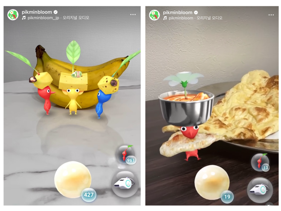 그리고 내가 모은 피크민과 AR 카메라로 사진을 남길 수 있어요. 피크민들이 카메라 속에서 움직이는 모습을 보는 것도 또 다른 재미입니다.