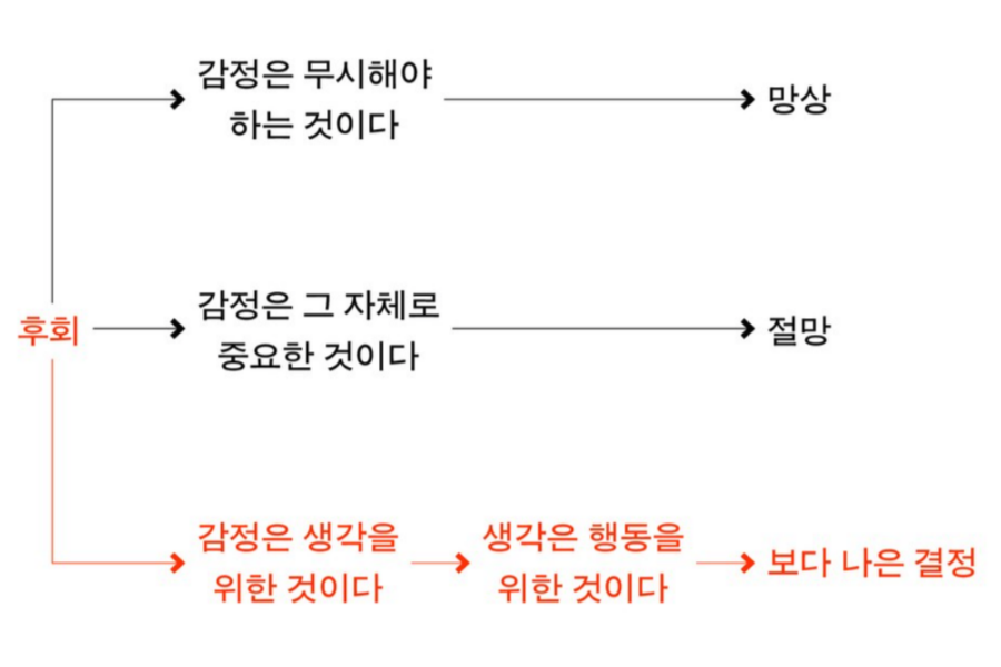 다니엘 핑크가 후회에 대한 가장 생산적인 반응이라고 본 관점입니다. 감정은 생각을 위한 것이고, 생각이 행동을 위한 것이라면, 후회는 우리를 더 나은 사람으로 만들어 주기 때문입니다. 즉, 후회라는 감정을 생산적인 생각으로 바꾼다면, 그 생각이 더 나은 행동을 낳고, 좋은 행동이 쌓여 우리는 결국 후회를 더 나은 선택으로 바꿀 수 있습니다.