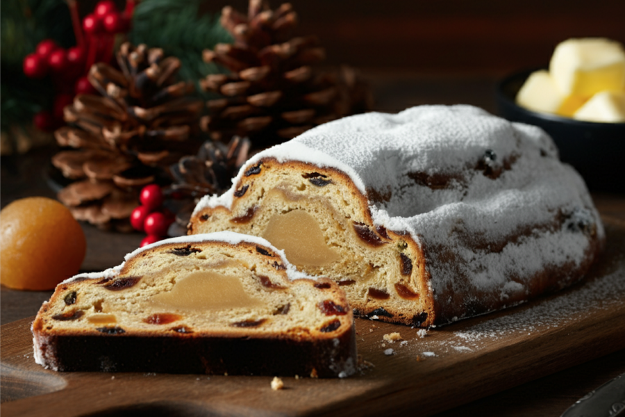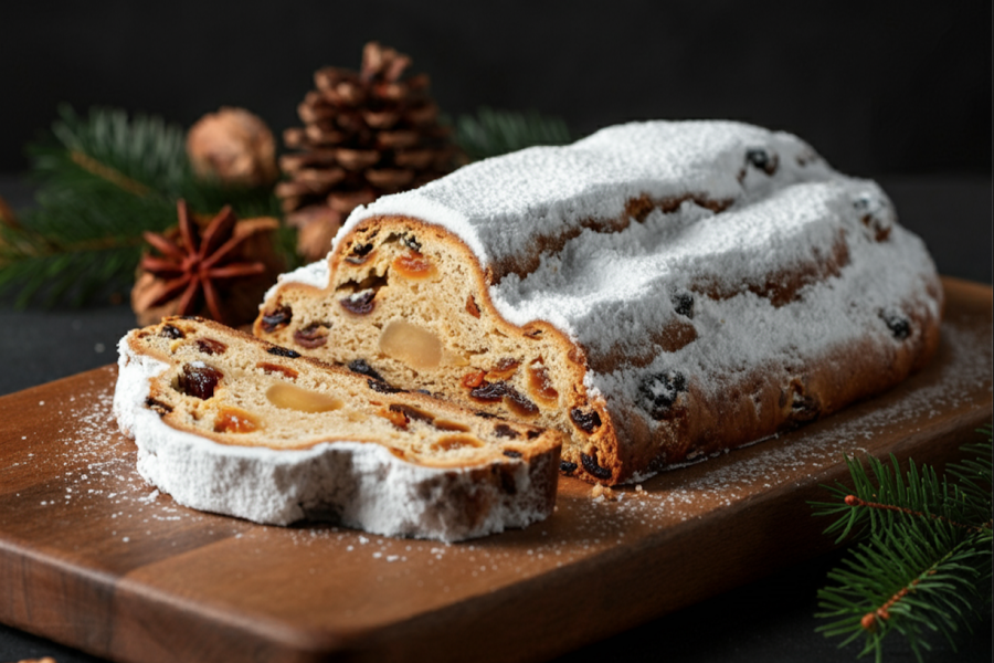 슈톨렌은 본래 독일에서 크리스마스 시즌에 전통적으로 먹어온 디저트 빵. 이스트로 발효시킨 반죽에, 브랜디 혹은 럼에 절인 건과일과 견과류, 맵싸한 향미의 계피나 카다멈(cardamom) 등의 향신료를 섞어서 굽고, 구워낸 직후의 빵 외피 곳곳에 녹인 버터를 빠짐없이 바른 뒤, 다시 새하얀 슈거파우더를 듬뿍 발라 완성시키는데요.