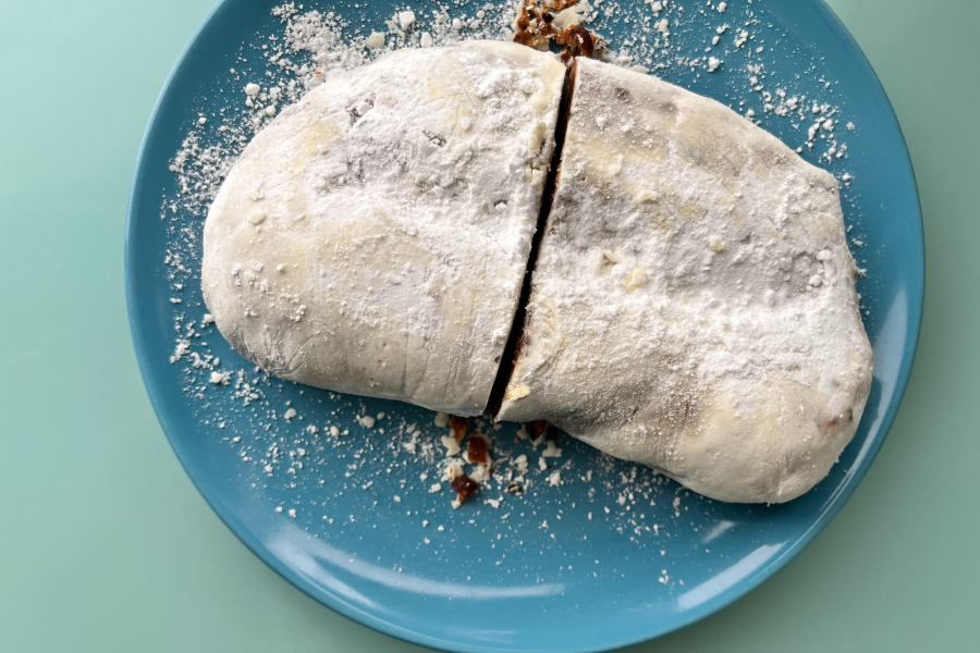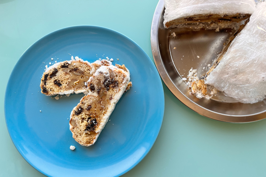 크리스마스를 기다리면서 계속 숙성시켜 가며 먹는, 아주 깊고 농후한 풍미, 그리고 이루 말할 수 없이 그윽한 향미의 빵이죠. 두텁게 도포된 버터와 슈거파우더가 공기를 차단하는 역할을 하니 꽤 오랜 기간 두고 먹을 수 있는데요. 한가운데부터 얇게 썰어 먹고, 자른 단면을 맞붙여 밀봉해 상온에 두면 보름 이상도 거뜬한, 디저트 빵으로서는 드물게 수명도 긴 빵.