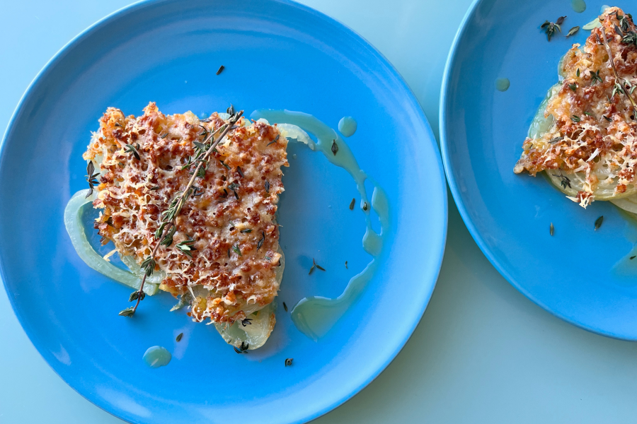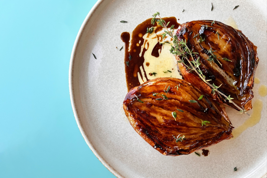 - 다시 양파 껍질 쪽이 바닥으로 가게 뒤집은 후, 팬을 살짝 기울여, 기울인 쪽으로 고인 오일을 스푼으로 떠서 양파 단면에 계속 끼얹는 ‘아로제(arroser)’ 공정을 반복, 2~3분 더 구우면 끝! (생 타임을 팬 한 귀퉁이에 두고 아로제를 하면, 양파에 허브 향이 깊게 스며 한층 고풍미로 완성됩니다.)