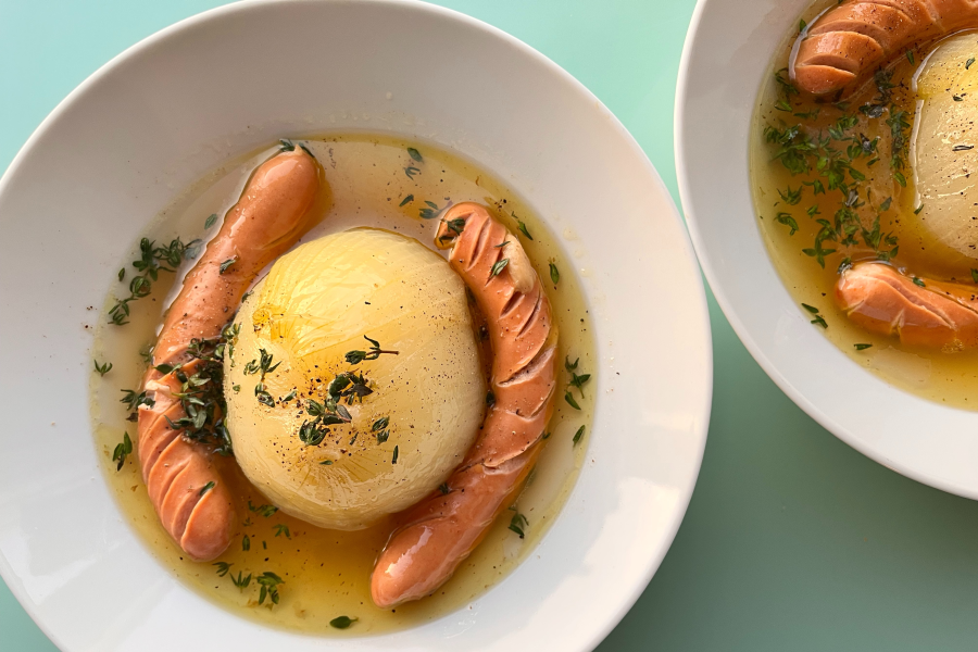 - 완성되면 냄비에서 양파를 먼저 건져 수프 그릇에 담은 다음, 그 옆으로 소시지와 베이컨을 담고 국물을 부어 줘요. 그리고 차이브나 이탈리안 파슬리, 바질 등 좋아하는 허브를 다져서 뿌리고(타임 잎만 따서 올려도 좋고요), 풍미 좋은 엑스트라 버진 올리브오일 한 바퀴 두른 뒤 먹으면 정말 기가 막히게 맛납니다. 홀그레인 머스터드를 소시지에 곁들여 먹으면 한층 더 맛난 건 말할 것도 없고요. 추운 겨울 별미로 딱. 좀 더 볼륨 있게 먹고 싶다면, 올리브오일에 바싹 구운 바게트 좀 곁들여도 좋을 테고요.