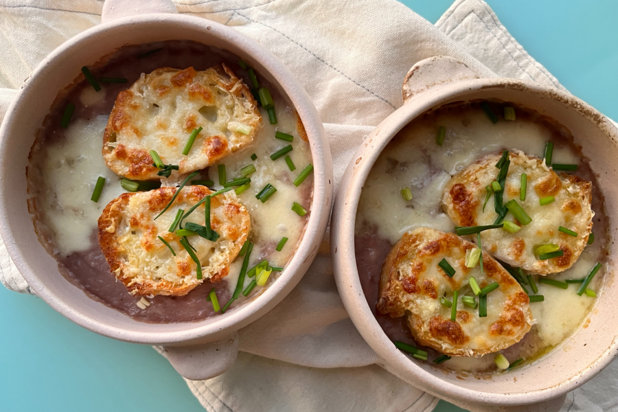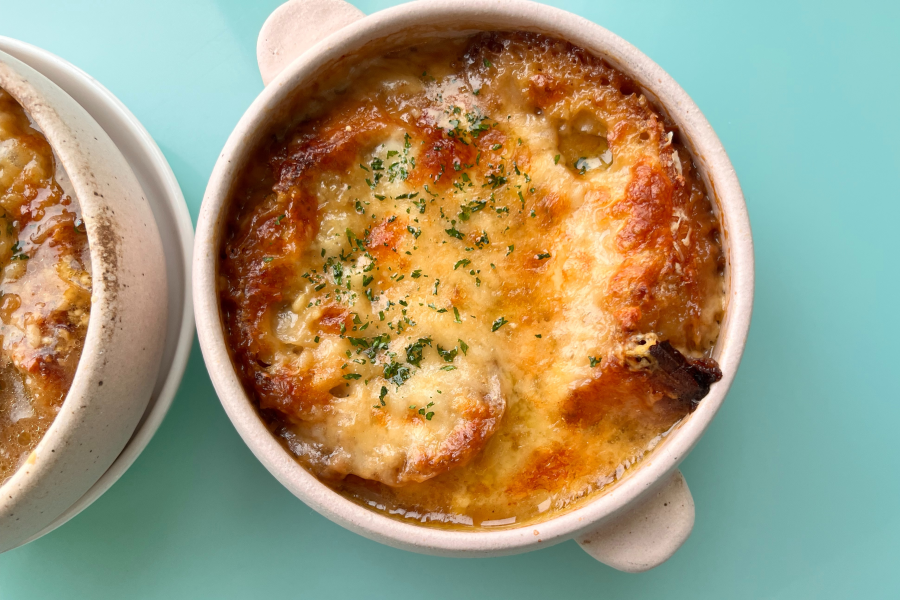 양파를 끈기 있게, 뭉근히, 오래도록 볶아 진한 갈색이 감돌 즈음이면, 당류 일부가 향기롭고 달콤한 멜라노이딘(melanoidin)으로 변하며 깊고 농후한 단맛을 내게 됩니다. ‘멜라노이딘’이란 마이야르 혹은 메일러드 반응(Maillard reaction)으로 생기는 갈색 색소를 가리키죠. 메일러드 반응이 일어날 때, 즉 가열 조리하는 동안 아미노산과 환원당 사이의 화학반응으로 인해 진한 갈색빛이 감돌고, 짙고 강렬한 감칠맛과 더없이 훌륭한 풍미가 나타나게 되는데요. 이 감칠맛 덩어리가 바로 프렌치 어니언 수프 맛의 요체가 됩니다.