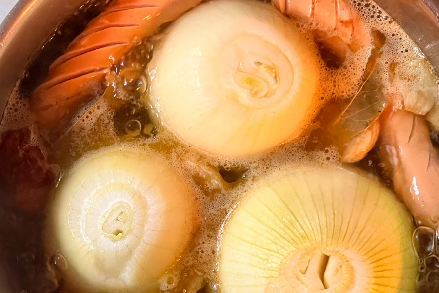 - 마늘 향이 기름에 밸 동안 양파 2~3개의 껍질을 까고, 꼭지와 뿌리 쪽도 얕게 잘라냅니다(너무 깊게 잘라내면, 끓일 때 양파가 다 흐트러지니 최대한 얕게 제거). 뿌리 쪽에 열 십자 칼집도 넣어 줘요(양파 길이의 1/3지점까지. 맛이 깊게 배게 하기 위한 공정이에요).