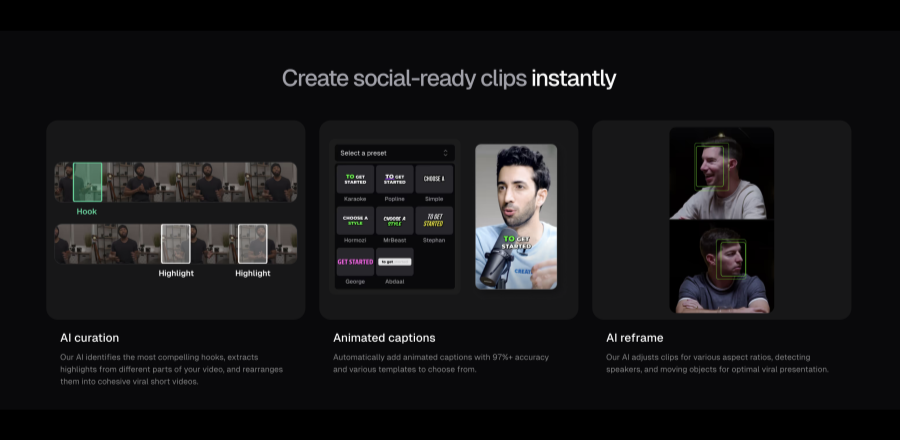 OpusClip만의 특별한 기능들도 있어요. ‘ClipAnything’ 기능은 97% 이상의 정확도로 자동 자막을 생성하며, 사용자가 원하는 장면을 자연어로 설명하면 AI가 해당 장면을 인식하고 클립을 생성해요. 특히 멀티모달 AI 분석이 인상적인데요. 비디오의 시각적 요소, 행동, 감정, 오디오 및 대화를 종합적으로 분석해 해당 순간을 이해하고 클립을 생성할 수 있어요.