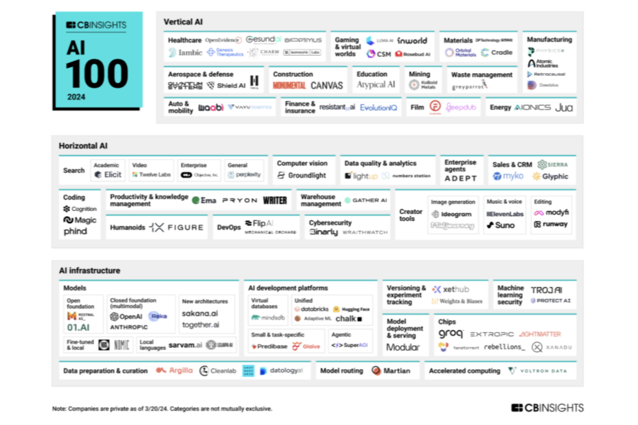 아주 다양한 도구들을 소개해 드렸는데요. 지금 AI는 매일 매일 새로운 서비스가 출시되고, 매일 ‘현존 최고’의 기술이 갱신되고 있는 영역이라 전부 배우거나 잘 쓸 수는 없다고 생각해요. 2024년 기준 AI를 기반으로하는 기업이 이렇게 많았다고 하는데요. 이 중 10%도 모르는 것 같네요.